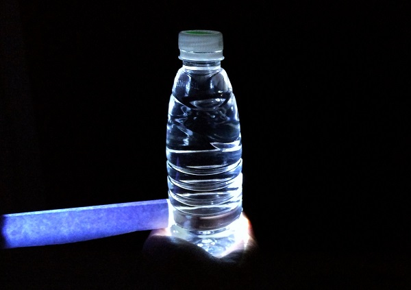 4.把手电筒套上纸筒,从瓶子另一侧照射瓶上的洞。