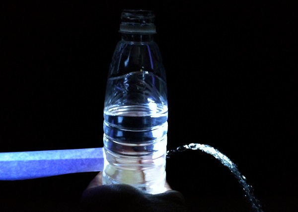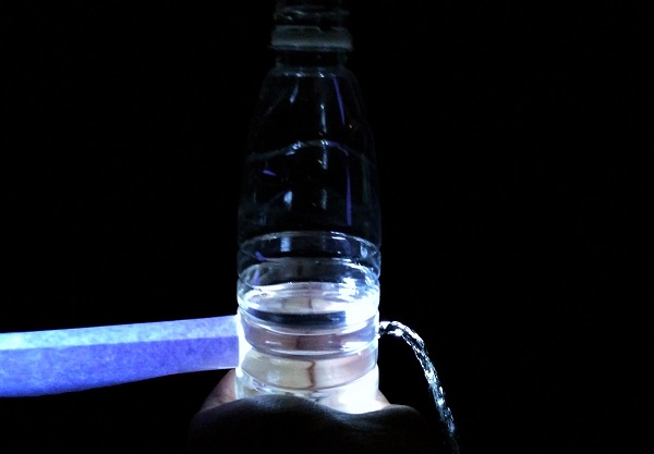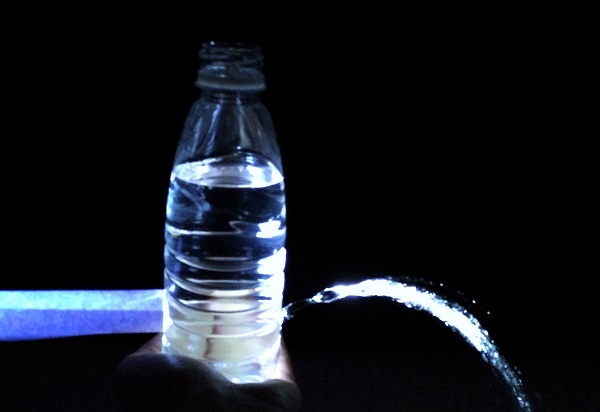 5.拧开瓶盖,水喷出来了!看,光线随着水流也拐弯啦!